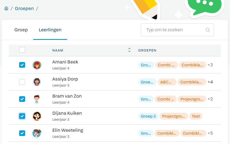 Leerlingen selecteren - Wil je leerlingen die niet in één van jouw primaire groepen zitten, of collega's koppelen, vraag dan je ICT-coördinator om dit te doen.
