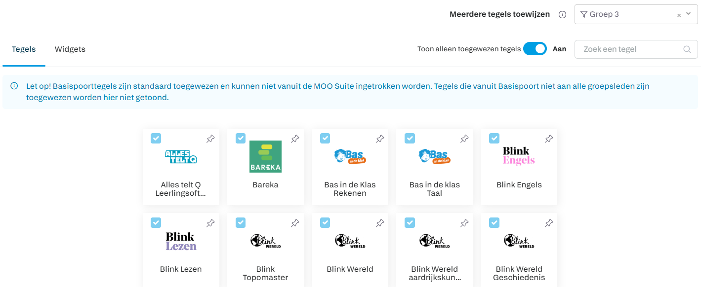 Soms is het handig om te kunnen zien welke tegels aan een groep toegewezen zijn. Bijvoorbeeld om te controleren of de leerlingen wel alle benodigde methodes hebben.