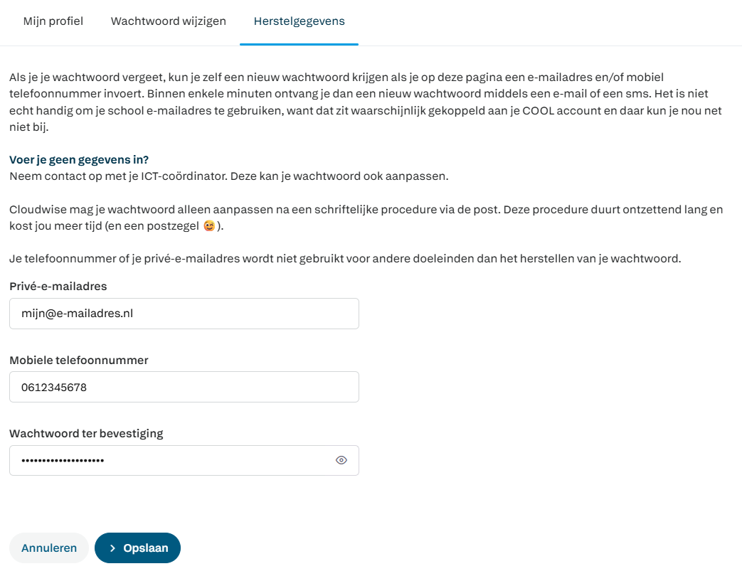 - Ook als ICT-coördinator is het advies om herstelgegevens in te vullen, mocht je in de toekomst je wachtwoord vergeten is het erg fijn dat er een mogelijkheid is om je wachtwoord zelf te resetten.
